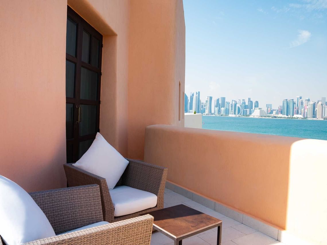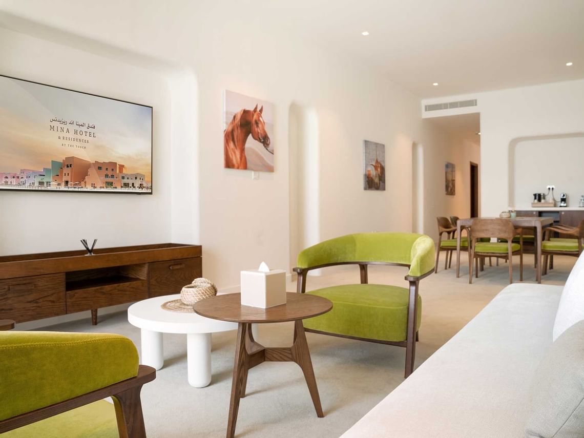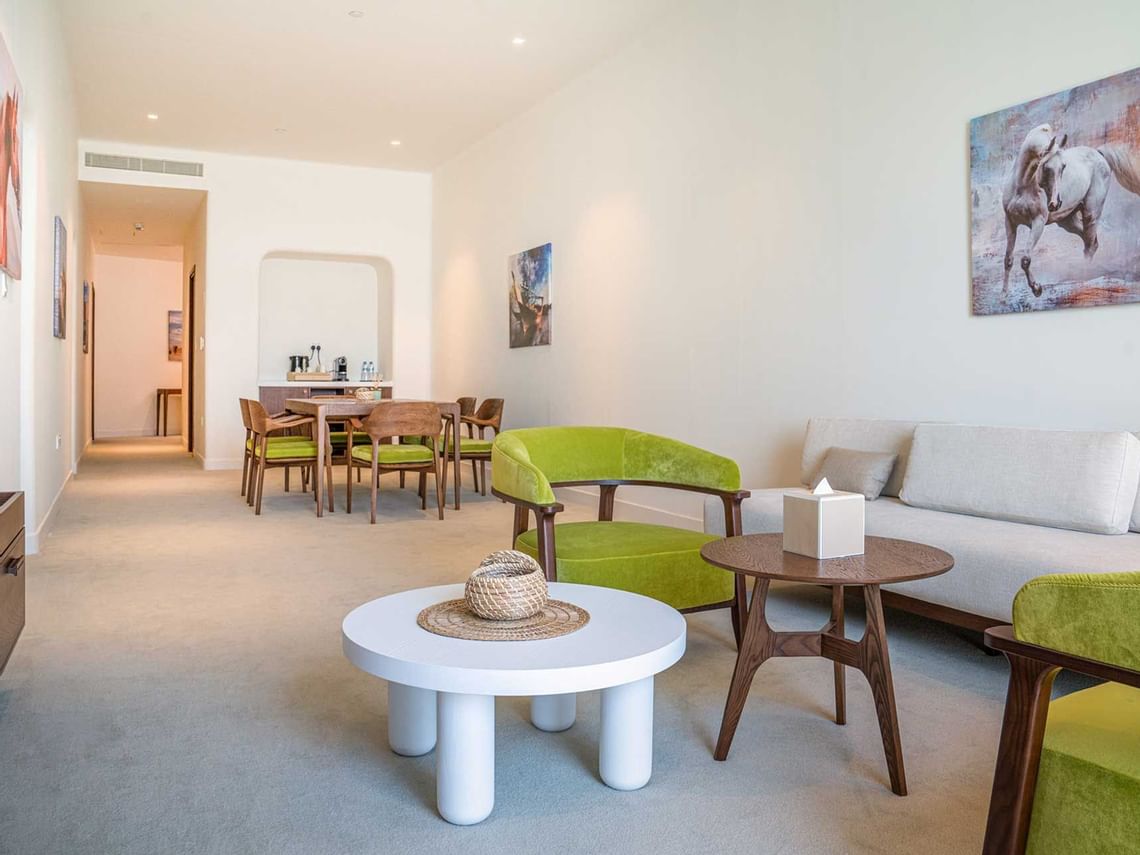 Contemporary style with cultural touches 90sqm Junior Suite features a separate bedroom, living room and balcony with enticing views to the sea, West Bay and the Cruise terminal.